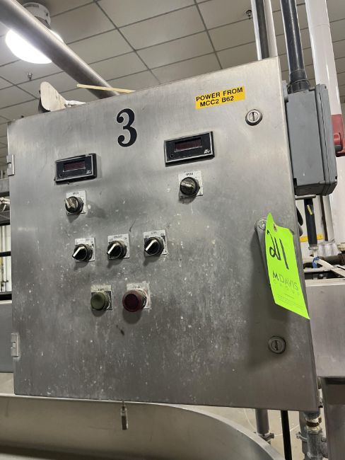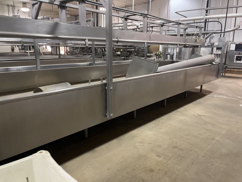 Damrow S/S Finishing Table, Internal Dims.: Aprox. 50 ft. L x 6 ft. W x 1 ft. Deep, Mounted on Legs (Table 6) (LOCATED IN MANTECA, CA)(RIGGING, LOADING, & SITE MANAGEMENT FEE: $1,750.00 USD)