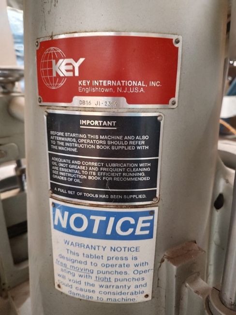 Key International 16 Station Rotary Tablet Press, Model DB-16. Tablets up to 5/8” (16 mm) in diameter. The press is single sided. Rated up to 1000 TPM. This listing is only available to USA Customers only. DEA Paperwork will be filed in accordance with DEA Guidelines. As shown in photos. (Located Central New York, NY)
