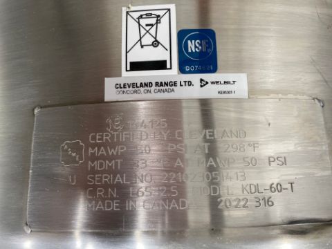 Cleveland 60 Gallon Kettle with Tilt Discharge. Unit was made in 2022. 316 Stainless Steel. MAWP: 50 PSI @ 298 DegF, MDMT: 33 DegF at MAWP 50 PSI. As shown in photos. (Located Central New York, NY)