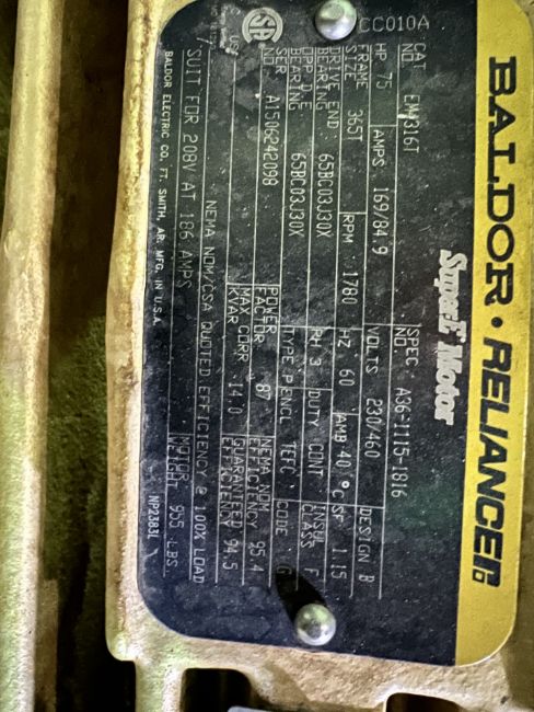 WORTHINGTON SINGLE CASE AXIALLY SPLIT CENTRIFUGAL PUMP, MODEL 6LR-13A/12.75 SF, 175 PSI @ 100 F, RELIANCE 75-HP MOTOR, 230/460 V, 1780 RPM (EVAPORATIVE CONDENSER PUMP) (SIMPLE LOADING FEE $275)