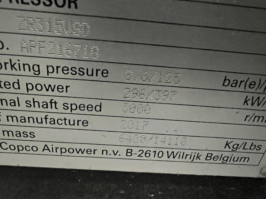 2017 ATLAS COPCO AIR COMPRESSOR, MODEL ZR315 VSD-FF, S/N APF216718, 8.6 BAR 125 PSI, 19,863 HOURS (SOLD SUBJECT TO CONFIRMATION OF BID)