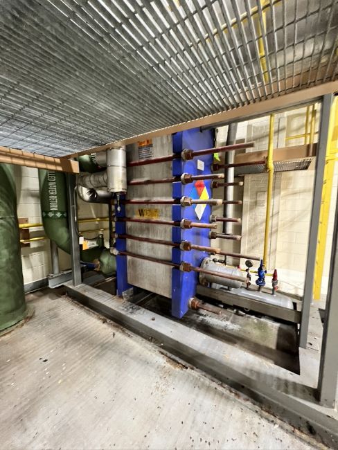 CHILLED WATER SKID WITH ALFA LAVAL PLATE FRAME HEAT EXCHANGER, MODEL M20 MWFD, S/N 30105-63592, SQ FT (SIMPLE LOADING FEE $12,650)