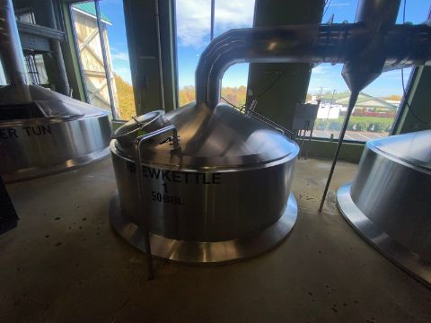 50 BBL. (2,200 GAL.) S/S Brew Kettle, with S/S Top Mounted Hinge Man-Door, Mounted on S/S Legs & Frame (RIGGING, LOADING, & SITE MANAGEMENT FEE: $7,000.00 USD) (LOCATED IN FREDERICK, MD)