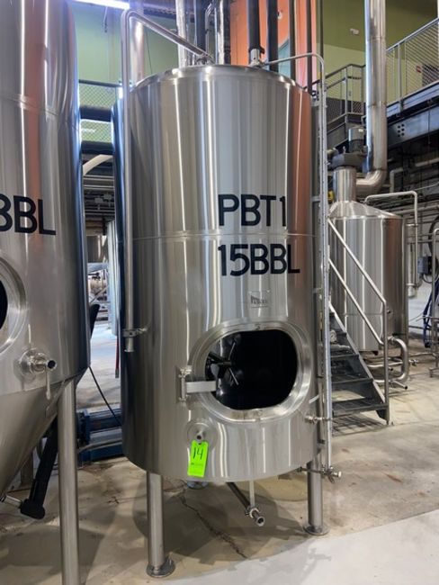2014 JVNW 15 BBL (465 GAL.) S/S Jacketed Vertical Tank, S/N 22897, 69 PSI Int. Press @ 200 F, 0 F @ 69 PSI, Internal Dims.: 6.7 ft Tall x 3.7 ft. Dia., with CIP Spray Ball, Mounted on S/S Legs (PFV1)(RIGGING, LOADING, & SITE MANAGEMENT FEE: $850.00 USD) (LOCATED IN FREDERICK, MD)