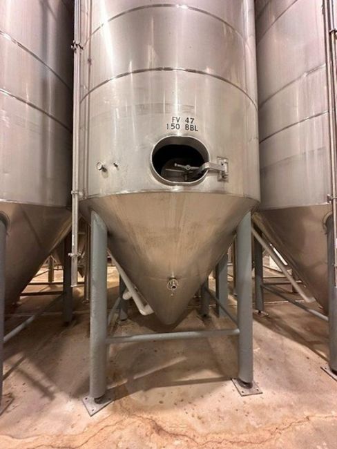 150 BBL (4650 Gallon) Vertical Cone Bottom 304 Stainless Steel Jacketed Vessel. Manufactured by Santa Rosa Stainless Steel in 1995. Serial #97642.  Jacket designed for 14.8 psi. 19'3"Tall x 8'10" Dia. Spray ball CIP, cone bottom, dished top. Weight 5866 lbs Previous Use: 150BBL Jacketed/Insulated Unitank for Beer Fermentation (RIGGING, LOADING, & SITE MANAGEMENT FEE:  $4,000.00 USD) (LOCATED IN FREDERICK, MD)