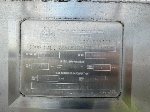 SFI 5,000 Gal. S/S Single Wall Vertical Tank, M/N 102"Id x 135"SW, S/N 3445 Mounted on S/S Legs (LOCATED IN FREEHOLD, N.J.) (Simple Loading Fee $4,620)