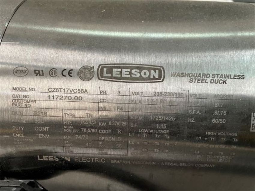 Aprox. 10" Wide x 281" Long Incline S/S Sanitary Intralo Belt Conveyor with 1/2" High Cleats, 9" Apart, Infeed 9" High, Discharge 13.5"; 2" Guide Rails Run Entire Length of Conveyor, Portable Locking Casters, Lesson S/S Wash Down Drive Motor, See Motor Tag Photo for Specs. Unit was last used in the food industry as a pack off conveyor rom a bagger. System is in excellent working condition. This system will need to ship via flatbed due to the length of the unit. (Loading Fee $200) (Located Hortonville, WI)