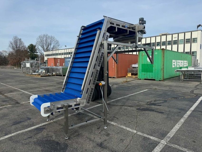 S/S “Z” CONVEYOR, WITH APROX. 3” DEEP X 5-1/2” W CLEATS, WITH NORD MOTOR (NOTE: INCLUDES THE S/S LEGS— SEE PHOTOS), (RIGGING, HANDLING, LOADING & SITE MGMT FEE: $350.00 USD)