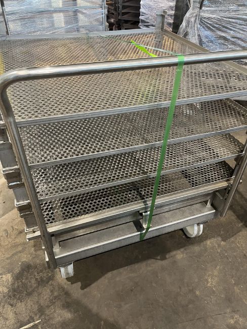 RETORT ACCESSORIES STAINLESS STEEL PUSH TROLLEY INCLUDES (4) RETORT TRAYS DIMENSIONS 3FT X 3FT (RIGGING, LOADING AND SITE MANAGEMENT FEE: $200.00)