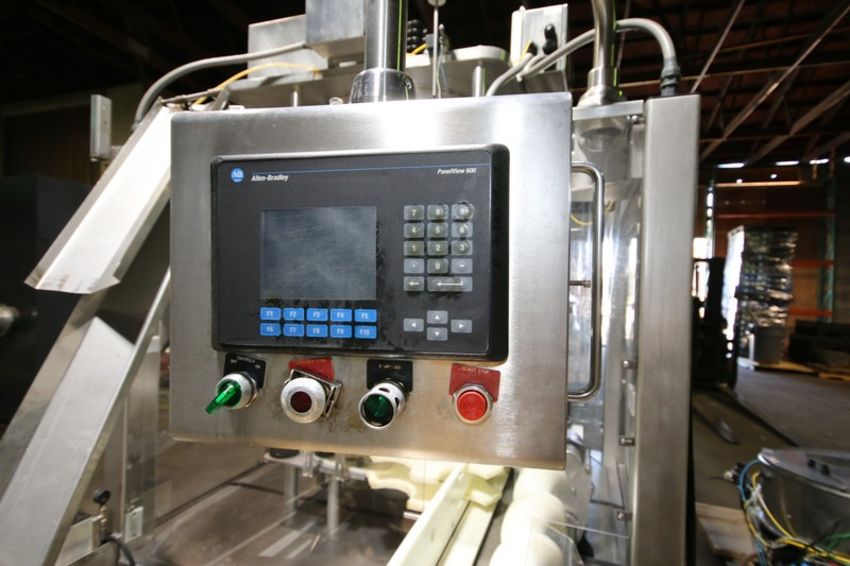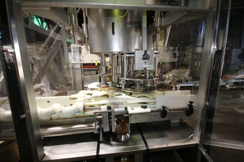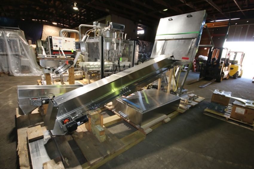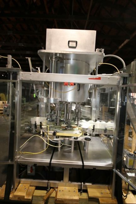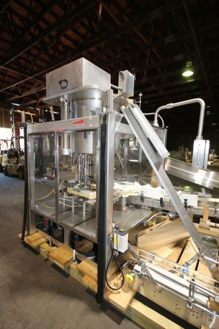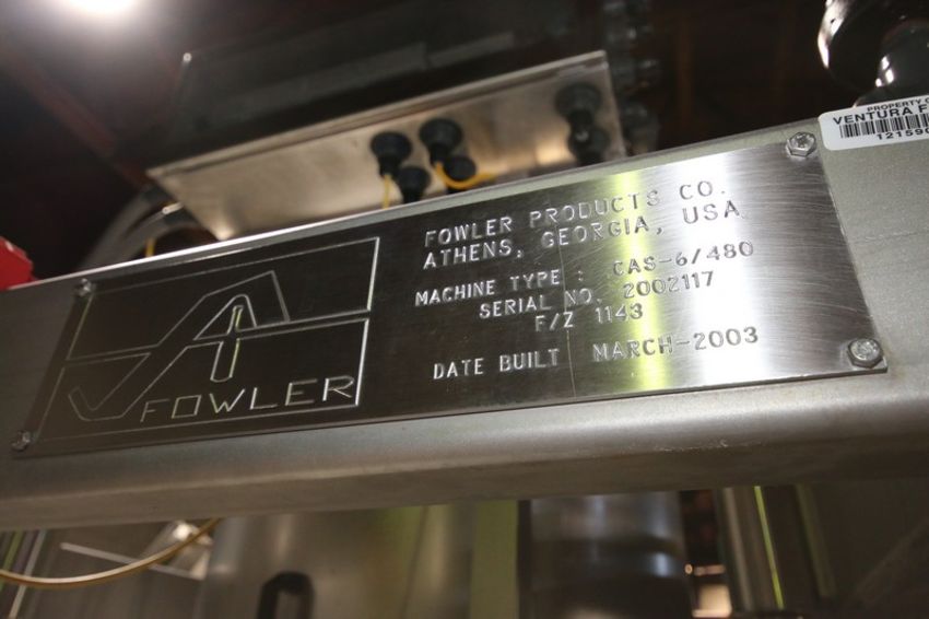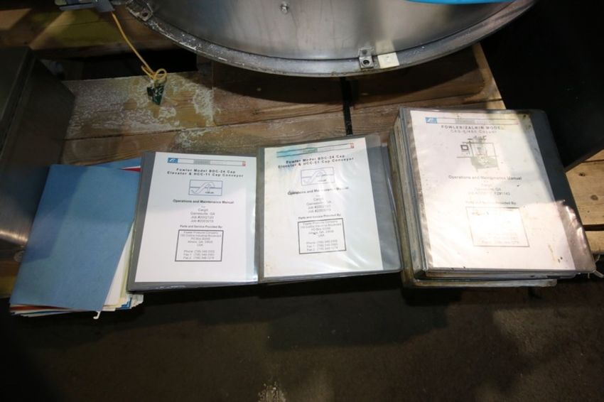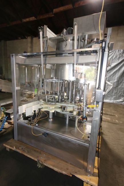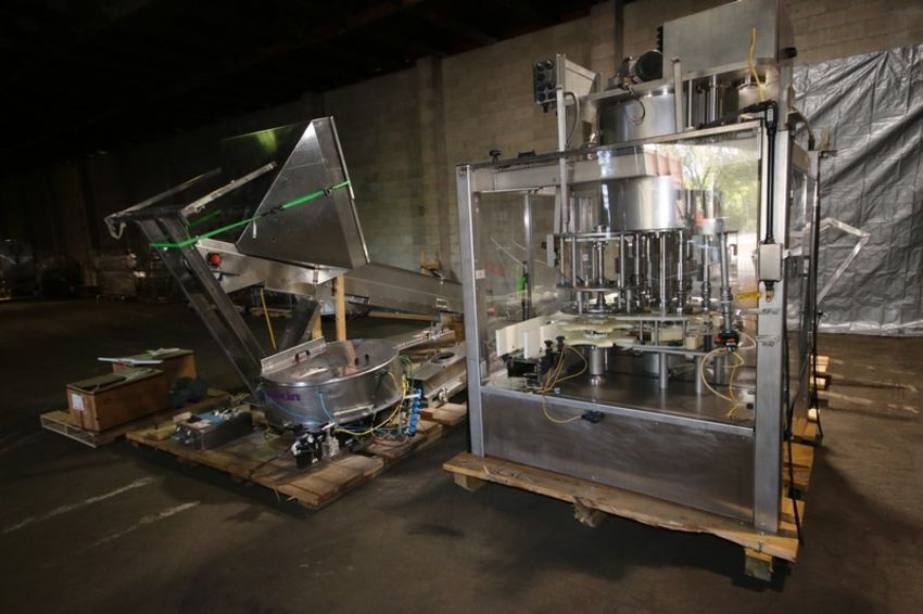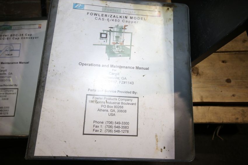Fowler Zalkin 6 - Station Rotary Capper, Mach. Type CAS-6 / 480, SN 20022117 F/Z 1143, Set up with 4 1/6” Chucks with 110 m / Gallon Change Parts, 8” W Infeed / Outfeed Conveyor, Includes 40” W Vibratory Feeder with Feed Rail, Aprox. 15 ft H Inclined Feed Hopper with 8” W Conveyor, 48” L x 48” W x 32” D Hopper, 11 ft L x 8” W Feed Conveyor, Includes S/S Control Panel with Allen Bradley 5/04 PLC Controller with Panelview 550 Display, Powerflex 70 VFD, 480V, Includes Some Spare Parts, (Built 2003) (INV#88446)(Located @ the MDG Auction Showroom in Pgh., PA)(Handling, Loading & Site Management Fee: $2,200)