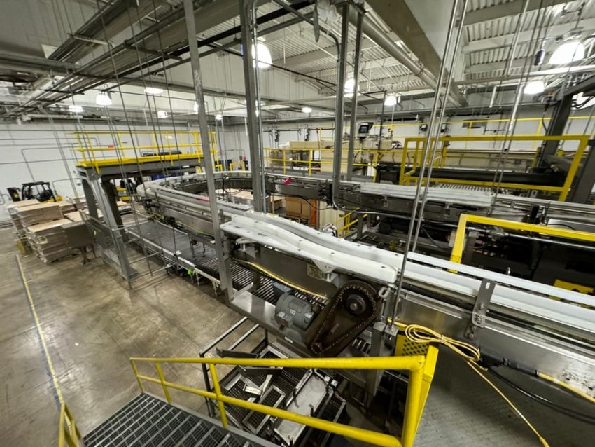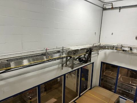 S/S Overhead Product Conveyor, with Guides & Drives, Overall Length: Aprox. 110 ft. (NOTE: From Depalletize Accumulation to Jar De-Elevator) (SOLD SUBJECT TO CONFIRMATION) RIGGING, LOADING, & SITE MANAGEMENT FEE:  $600.00 USD)(LOCATED IN WAVERLY, IA)