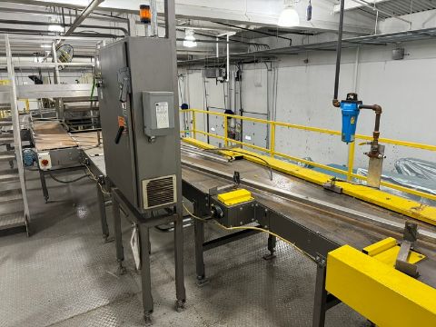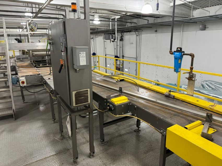Goldco Discharge Accumulation Conveyor, with Guide Rails & Drives, with Control Panel (SOLD SUBJECT TO CONFIRMATION) RIGGING, LOADING, & SITE MANAGEMENT FEE: $600.00 USD)(LOCATED IN WAVERLY, IA)