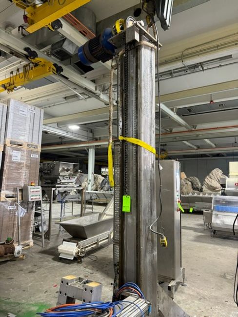 Racking System, Includes Optimar S/S Column Lift with Push Attachment, with S/S Control Panel, with Controls, with ODIM S/S Double Sided Turn Table, with Orientor with Blue Conveyor Belt, Aprox. 19" W, Mounted on S/S Frame (RIGGING, LOADING, & SITE MANAGEMENT FEE: $650.00 USD) (LOCATED IN GLOUCESTER, MA)