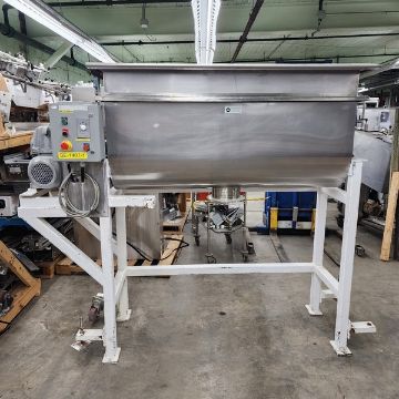 CLI 14cf Ribbon Blender 575 v 3 phase missing discharge valve fonctionnal. Dimensions of 42'' x 98'' long x 76'' tall 8'' discharge hold (Item #102S) (Simple loading $400). (Located Huntingdon, Quebec, Canada)