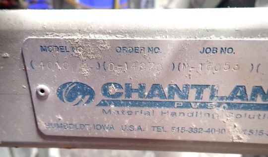 Chantland Rapid Flow Impeller Bag Filler, Model 4010, Designed to Fill Valve Style Bags with High Bulk Density Powder Products Such As Portland and Masonry (Plastic) Cements, Fine Ground Gypsum, Hydrated Lime, Fly Ash, Fine Ground Calcium Carbonate, Talc, Silica Flours, Insecticides, Clay Products, Stucco and Similar Products. Design Features: Scale-Beam Gross Weigh, Impeller Feeder, Manual Start Switch, Mechanical Tilting Bag Chair, Pneumatic Bag Clamps, TEFC 230/460 V, 60 hz., 3 Phase Drive, NEMA 12 Elecgrical System, 1.1/2 CFM @ 80 PSI per Spout Pneumatic Controls. Fill Rates up to (8) 94 lb. Bags or (10) 50 lb. Bags per minute for cement. (12) to (14) 25 lb. Bags Per Min. for Tile Grouts, Fill Weights 20 lbs. per 110 lbs., Weight Accuracy: +/- 6 to 8 ounces from Target Weight (+/- 2 to 4 oz. with Load Cells) (Crating Fee $400) (Please inquire for shipping rates) (Located Winter, WI)
