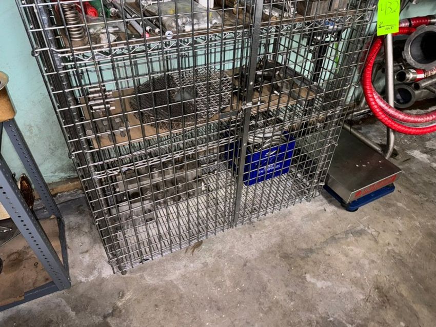 Lot of Shelving Units & Contents, Includes Motors & Drives, Lightnin Agitator, Cage of Homogenizer Parts, Portable Cage, & Other Units & Contents in Photographs (RIGGING, LOADING, & SITE MANAGEMENT FEE: $400.00 USD)(LOCATED IN MOORE RD. WEYMOUTH, MA)