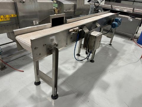 Straight Section of S/S Conveyor, Conv. Dims.: Aprox. 116" L x 10" W Belt x 37" H Belt to Floor, Mounted on S/S Legs (RIGGING, LOADING, & SITE MANAGEMENT FEE: $100.00 USD)(LOCATED MOORE RD. WEYMOUTH, MA)