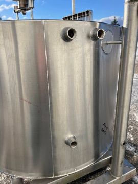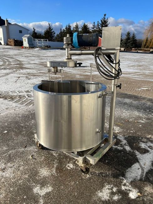 Aprox. 50 Gal. Vat Pasteurizer / Cheese Vat, Water Jacket, Held Pressure @ 23.5, 4" Lockable Swivel Casters, Leeson Motor, Refurbished Exterior Bottom, Leeson Motor, 1/4 hp, 90 Volt, 1750 RPM, Single Phase, Leeson Speed Control, (1) Paddle, (2) Mixxing Paddles, (3) Curd Cutting Knives, Removable Cover with (1) 4" and (4) 2" Inlets, (3) 1" Inlet for Steam Jacket, Air Space Heater, 2" Bevel Seat Leak Detect Valve, Inside Dimensions Aprox. 29" Dia. x 20" Deep, Overall Dimensions Aprox. 43" W x 56-1/2" H (Unit #3676) (Loading Fee $100) (Located Pulaski, WI)