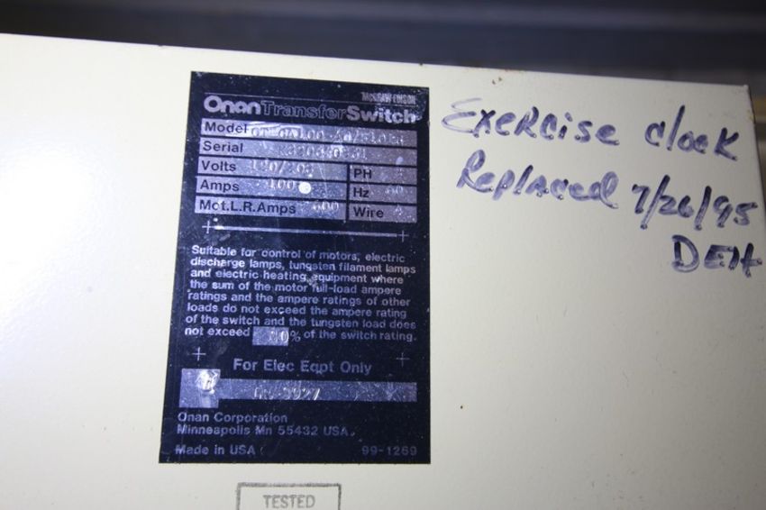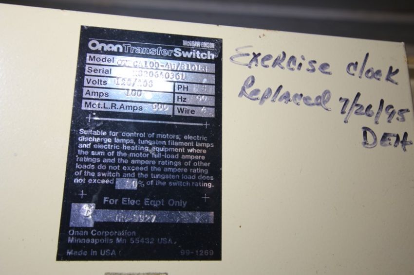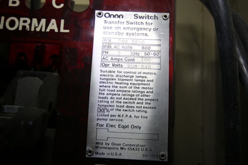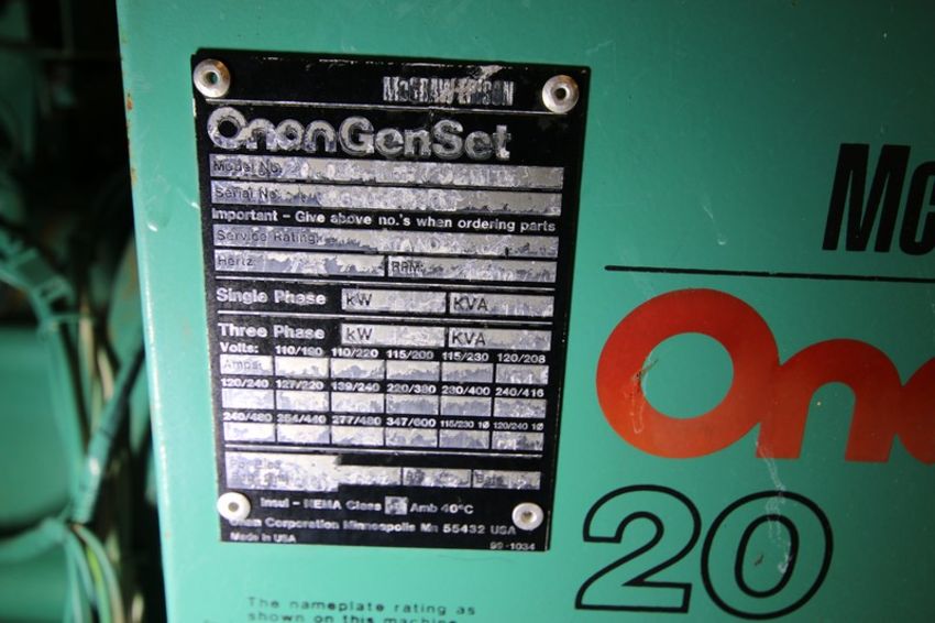 Onan 20 Standby Generator Set, Model 20.OES-15R/2571B, SN H830672409, with Ford 4 Cylinder 2.3 L Engine, SN TCA-1132-1146, Single Phase - 13.3, 16.7 KVA, Three Phase - 18.5, 23 KVA, 1800 rpm, Natural Gas, 552 Metered Hours, Includes Onan Transfer Switch PN 306-2240 208-240V 3 Phase, & GE Zenith Controls Cabinet (INV#103011) (Located @ the MDG Auction Showroom in Pgh., PA) (Loading, Handling and Site Management Fee $100)