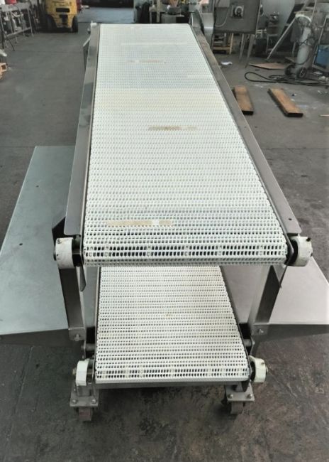 Dual 18" White Intralox Belt Conveyor Pack Off S/S Conveyor, Both Belts are 18" W x 72' Long, Tables measures 15-1/2" w x 56-1/2" Long - Unit is currently set up with a slight incline. Current infeed is 17" and 36" High with a discharge of 24" and 48" -- 1/2 hp S/S Washdown Drive, 3/60/230/460 V, Single Drive Drives Both Conveyor Belts, Adjustable Legs to Vary infeed and discharge heights, Portable on Casters -- Last used in the food industry and remains in excellent working condition.(Crating Fee $200 plus Loading Fee $100 = Total $300) (Located Winter, WI)
