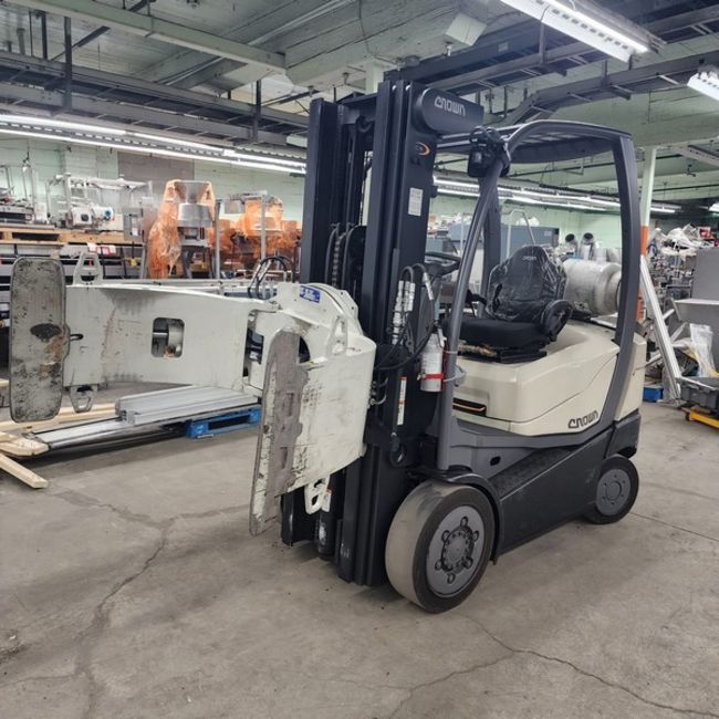 Crown 8,000 lb. Capacity Forklift, Model C-5 10001-40, S/N 9A233081, Year Mfg. 2018, Type LP Propane Gas, 1900 Hrs. with Cascade Paper Roll Clamp Type, 13H-RCF-E003 of Caqpacity up to 2,900 lbs., 1300 kg, 360 Degree Rotation Quickly Transition (Loading Fee $350) (Located Huntingdon, Quebec, Canada)