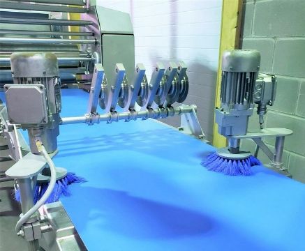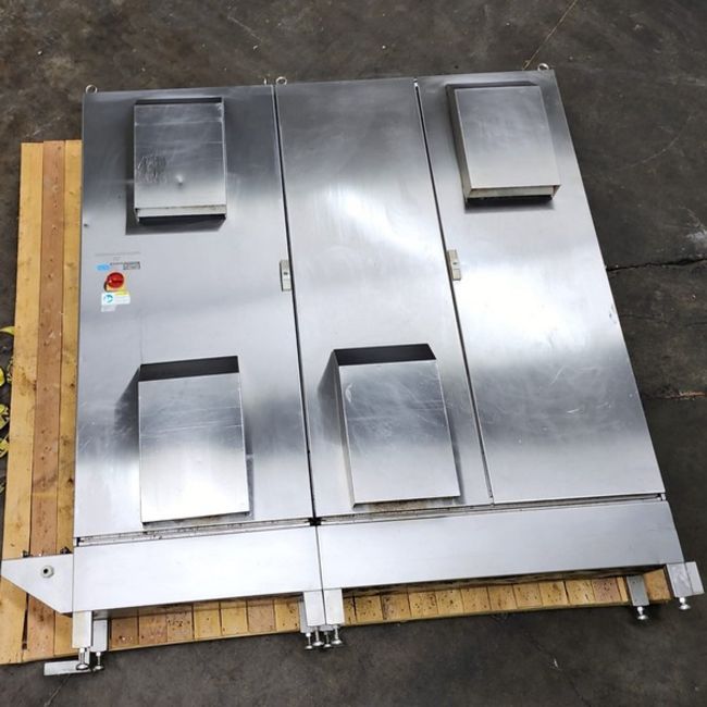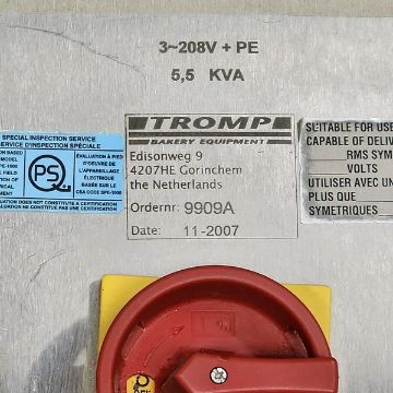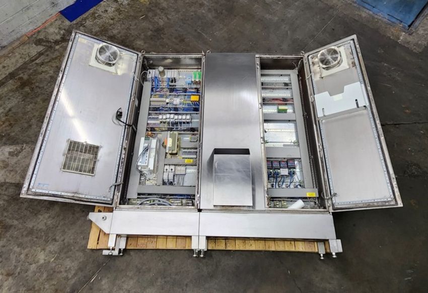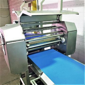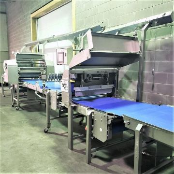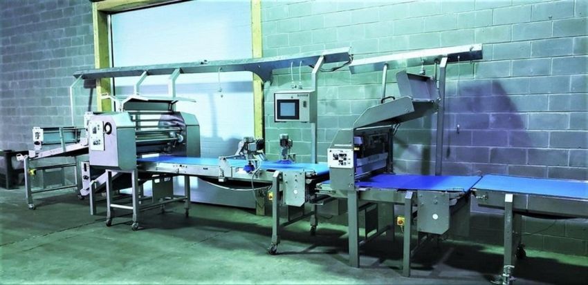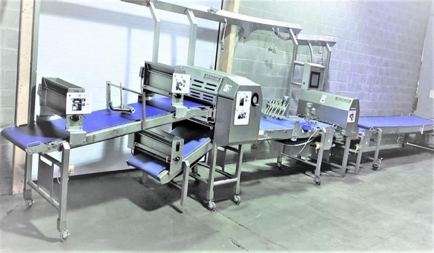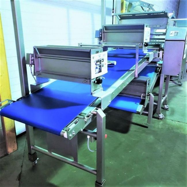 Tromp Bakery Line multi-purpose S/S Combines Dough and Flour Depositin, With Roller Sheeting, Fold Over Forming, Guillotine Cut-off Scrap Removal, Laminating, Slitting. (Item #101) (Located Huntingdon, Quebec, Canada) (Simple Loading Fee $1500)