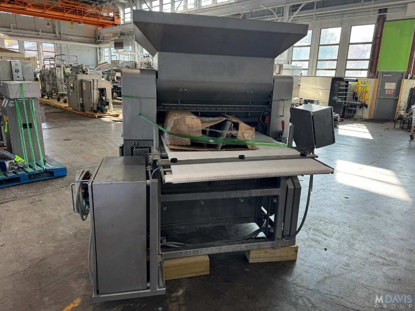 BRIDGE S/S PATTY FORMER, I-480, S/N I29606 0M, WITH APROX. 38” W PLASTIC INTERLOCK CONVEYOR, WITH CASTERS (PATTY FORMER #4), INCLUDES ENSIGHT S/S COLUMN DUMPER, M/N LL, S/N 2960G-OH, WITH S/S SAFETY CAGE, (RIGGING, HANDLING, LOADING & SITE MGMT FEE: $1,200.00 USD )