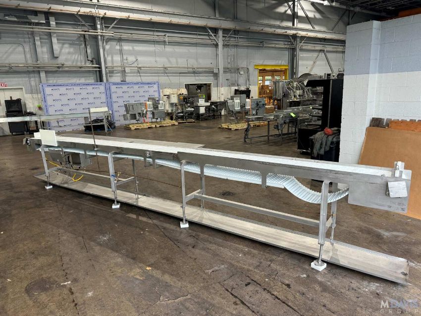 STRAIGHT SECTION OF S/S INSPECTION CONVEYOR, S/N C83458-105, BELT DIMS.: APROX. 248” L X 11-1/2” W PLASTIC BELT X 36” H (BELT TO GROUND), WITH APROX. 136” L X 12” W S/S INSPECTION TABLE, WITH S/S CLAD MOTOR, MOUNTED ON S/S FRAME, (RIGGING, HANDLING, LOADING & SITE MGMT FEE: $400.00 USD)
