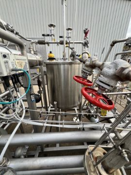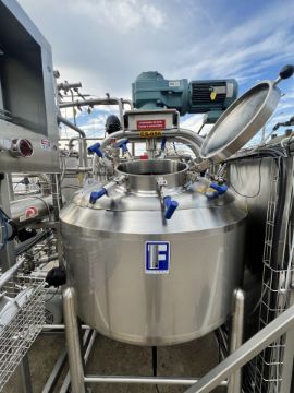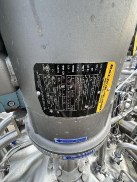 with Scott 7.5 hp / 3450 rpm Top Mounted Turbon Mixer, Mounted on Load Cells with Read Out, with (2) Enerquip 5 ft & 4 ft L S/S Heat Exchangers, S/N 12156 & 12153, (2) Alfa Laval 19” H Plate Heat Exchangers, Model M3-FG, (2) Fristam 15 hp & 1.5 hp Centrifugal Pumps, Aprox. 50 Gal. S/S Buffer Tank, with Related Valves by Alfa Laval, Signal, Kammer, Filters, Diaphragm Pump, Acid Holding Tank, Related Piping, Control Cabinet with Allen Bradley 1776 PLC Controller, Power Flex 70 VFD, 480V, (Note: Touch Pad Display Missing), (Aprox. Overall Dims. 183” L x 90” W x 115” H) (RIGGING AND LOADING FEE: $2,000.00)
