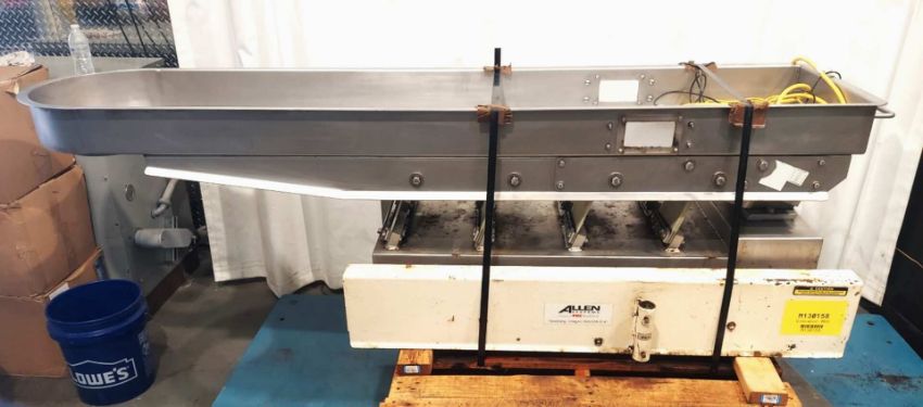 18” WIDE x 86” LONG ALLEN VIBRATORY CONVEYOR STAINLESS MODEL F7135112 TYPE FC SERIAL NUMBER CON20899 FEEDER TRAY DIMENSIONS 18” W x 85 ¾” L x 4 ¾ “ H 71 ½” LONG TO THE START OF OUTLET ALL STAINLESS STEEL MATERIAL CONTACT PARTS HANDLING, LOADING, AND SITE MANAGEMENT FEE: $150