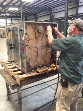 LANE MFG. CO. STAINLESS STEEL OVEN MODEL EHS-C. SERIAL NUMBER BK-18330. Interior Dimensions: 15″W x 20″H x 21″D Exterior Dimensions: 30″W x 25″H x 26.5″D. 4 Shelves. Complete with Computerized Controls with Manual Override System. Programmable Up to 10 Products, Independent Shelf Timers for Each Shelf, Single Speed Fan, Mounted on Portable S/S Stand, 208V, 1/3 Phase HANDLING, LOADING, AND SITE MANAGEMENT FEE: $100