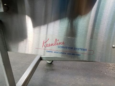 Keenline S/S Sanitary 90 deg intralox belt conveyor, Serial # 20211SAR, This unit was last used in the food industry conveying cheese. The unit is as nice as you will find used. with 18 inch wide belt, 94 inches overall length, 3/4 hp Baldor drive 3/60/208-230/460 volt, Current infeed height is 12 inches (this is adjustable), Current discharge height is 27 inches ( this is adjustable), Unit is portable on locking casters (We will crate the unit charge for 250 dollars to ship common carrier) (Loading Fee $50) (Located Winter, WI)