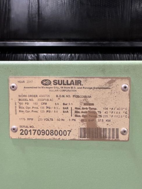 Sullair 40 hp Compressor, Model 3009PVB AC, Serial 201709080007, 240 volts, Variable speed drive , 41,000 hrs working flawlessly when removed, 72” OAW, 62”OAH, 35”OAL (Loading Fee $150) (Located Harrodsburg, KY)