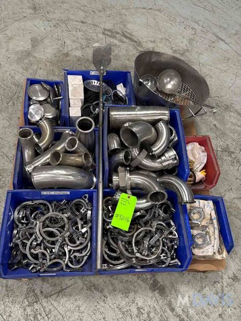 LOT OF MISC. S/S SANITARY FITTINGS, INCLUDES ASSORTED SIZED CLAMPS, ASSORTED SIZED ELBOWS,REDUCERS, CAPS, GASKETS, STRAINERS, LADLES & HAND MIXER, (INV #32416) (LOCATED @ MDG SHOWROOM - PITTSBURGH, PA) (RIGGING, HANDLING, LOADING & SITE MGMT FEE: $75)