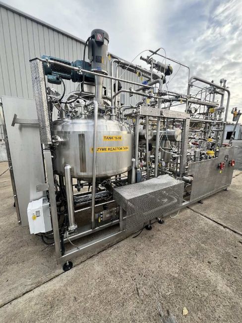 2010 Sterling Process Engineering Enzyme Skid Includes Feldmeier Aprox. 200 Gal. Dome Top, Cone Bottom Jacketed S/S Processing Tank, SN E097909, 316L S/S, Includes SEW 7.5 hp / 1720 rpm Drive Motor, Bottom & Side Scrape Surface Agitator with Scott 7.5 hp / 3450 rpm Top Mounted Turbon Mixer, Mounted on Load Cells with Read Out, with (2) Enerquip 5 ft & 4 ft L S/S Heat Exchangers, S/N 12156 & 12153, (2) Alfa Laval 19” H Plate Heat Exchangers, Model M3-FG, (2) Fristam 15 hp & 1.5 hp Centrifugal Pumps, Aprox. 50 Gal. S/S Buffer Tank, with Related Valves by Alfa Laval, Signal, Kammer, Filters, Diaphragm Pump, Acid Holding Tank, Related Piping, Control Cabinet with Allen Bradley 1776 PLC Controller, Power Flex 70 VFD, 480V, (Note: Touch Pad Display Missing), (Aprox. Overall Dims. 183” L x 90” W x 115” H) (INV #31957) (LOCATED @ MDG SHOWROOM - PITTSBURGH, PA) (RIGGING, HANDLING, LOADING & SITE MGMT FEE: $2,500)