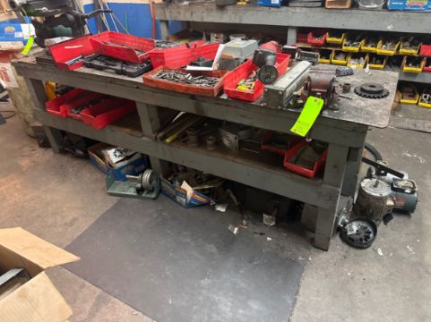 CONTENTS INCLUDES DRILL ATTACHMENTS, (2) VISES, DOUBLE EDGE GRINDER, CYLINDERS, INCLUDES SHOP TABLE  (RIGGING, LOADING, & SITE MANAGEMENT FEE: $120.00 USD)  (LOCATED IN APPLING, GA)