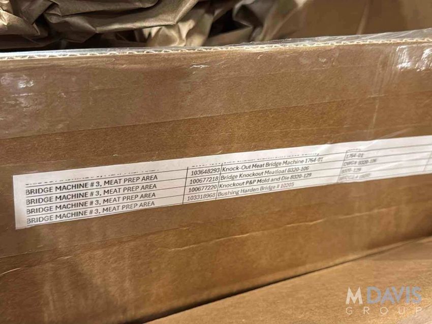 BRIDGE PATTY FORMER PARTS FOR #2,3 & 4, ON (2) PALLETS - INCLUDES (4) ROLLS OF 38 W INTRALOX CONVEYOR BELTING, (3) SHAFTS, DODGE, SEAL MASTER & OTHER BEARINGS, NYLON BOTTOM PLATES, CAM, FEED ROLLER, (2) ALLEN BRADLEY .2 KVA TRANSFORMERS, BRASS & NYLON BUSHINGS, YOKES, SEALS, SPACERS, CAM, (4) MAYR TORQUE LIMITERS, MAYR SAFETY SWITCHES, SPRINGS, PIN CLEVIS, KNOCK OUT MOLDS, KNOCKOUT CAM, CONVEYOR PARTS, (INVENTORY#34183)(LOCATED @ MDG SHOWROOM - PITTSBURGH, PA), (RIGGING, HANDLING, LOADING & SITE MGMT FEE: $200)