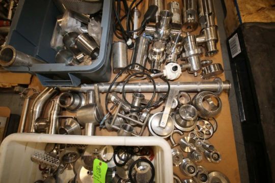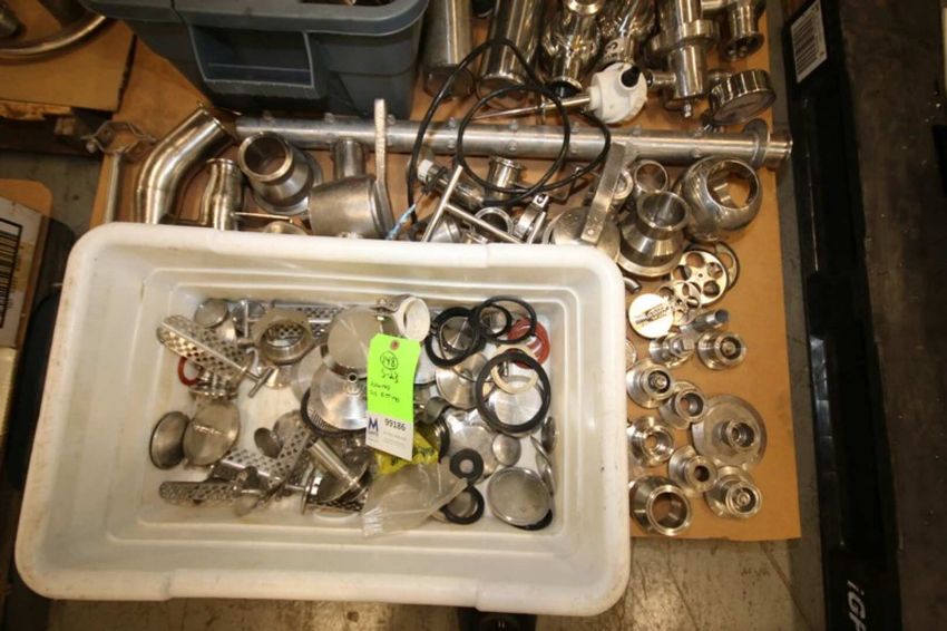 Pallet of Assorted S/S Fittings Including Caps, Connectors, Valves, Valve Parts, Sensor, Thermometer, Lumenite Probe, Sewer Drain Basket (INV#99186) (Located @ the MDG Auction Showroom in Pgh., PA) (Loading, Handling and Site Management Fee $50)