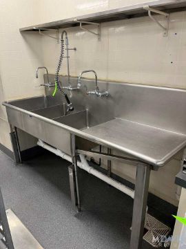 STAINLESS STEEL THREE COMPARTMENT SINK, NSF STAINLESS STEEL THREE COMPARTMENT SINK IS EACH BOWL 18W X 24L (LOCATED IN CHICAGO, ILLINOIS) (RIGGING, HANDLING, LOADING & SITE MGMT FEE: $100)