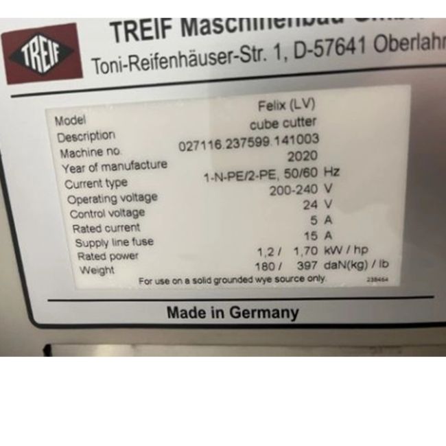 Treif Felix (LV) Cube Cutter, Year of manufacture: 2020. Stainless Steel construction. Aprox. 12” x 4” x 4” / 300 x 100 x 100 mm chamber Single phase: 220-240v. In good used condition. Suitable for raw and cooked meats; cheese and butter. (Machine #5230) (Lift Out Fee $200) (Located Jessup, MD)