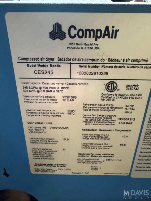Air Compressor: Type: L07-L22, S/N D105139, Air Dryer: M/N CES245, S/N 1000002816298, Includes (2) Vertical Receivers (LOCATED IN OAK CREEK, WI)(RIGGING, HANDLING, LOADING & SITE MGMT FEE: $640)