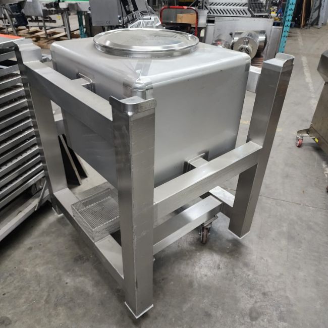 Sanitary Stainless Steel Tote. 75gal, 284lit, 10 sf. 32'' x 32'' x 46'' Conic botton 4 inch discharge With Legs on wheels. (Handling Fee $200) (Located Huntingdon, QC, Canada)