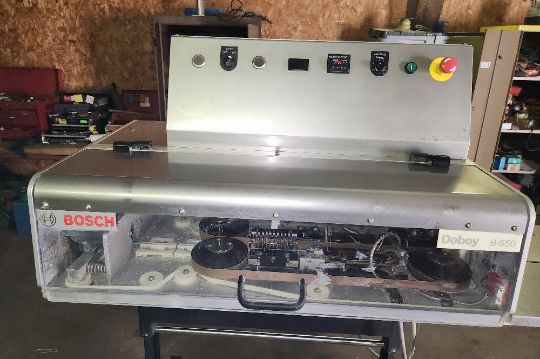 Bosch Doboy Industrial Band Sealer, Model B-550, S/N 15-32696, Mfg. 2015. System Just Removed From Service and Remains in Working Condition. Mfg. 2015, 1110 Volt, Variable Speed, Link Attached to Manual for the System, There are several videos of the ystem under power. Link to manual: https://www.slideshare.net/slideshow/boschdoboy-b550/11312770 (Crating and Loading Fee $500) (Located Winter, WI)