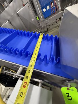 KEY WEST METAL INDUSTRIES CLEATED S/S INCLINE CONVEYOR, PROJECT NO 39836MC-2, APPROX 31 IN. W X 35 IN. D HOPPER, APPROX. 13 IN. W CONVEYOR BELT W/ 2 IN. CLEATS