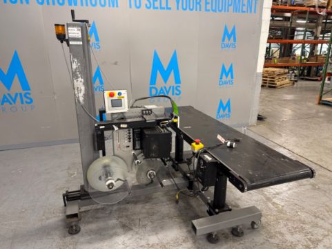 WEBER ROLL FED LABELER W53000332, MODEL 5300 R.H. DOM, WITH TOUCH PAD DISPLAY & SATO PRINTER, MOUNTED ON PORTABLE STAND WITH 6 FT L X 18 W POWER BELT CONVEYOR, 115V, (INV. #35907)(LOCATED @ MDG SHOWROOM PGH, PA), (RIGGING, HANDLING, LOADING & SITE MGMT FEE: $100)