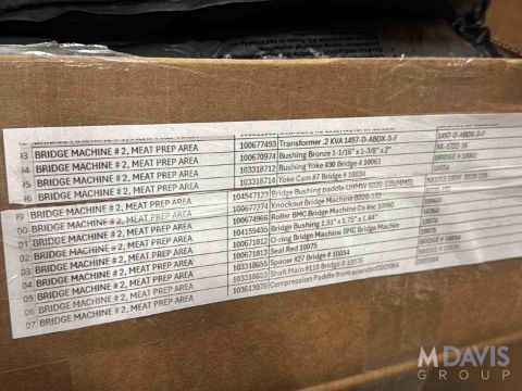 BRIDGE PATTY FORMER PARTS FOR #2,3 & 4, ON (2) PALLETS - INCLUDES (4) ROLLS OF 38 W INTRALOX CONVEYOR BELTING, (3) SHAFTS, DODGE, SEAL MASTER & OTHER BEARINGS, NYLON BOTTOM PLATES, CAM, FEED ROLLER, (2) ALLEN BRADLEY .2 KVA TRANSFORMERS, BRASS & NYLON BUSHINGS, YOKES, SEALS, SPACERS, CAM, (4) MAYR TORQUE LIMITERS, MAYR SAFETY SWITCHES, SPRINGS, PIN CLEVIS, KNOCK OUT MOLDS, KNOCKOUT CAM, CONVEYOR PARTS, (INVENTORY#34183)(LOCATED @ MDG SHOWROOM - PITTSBURGH, PA), (RIGGING, HANDLING, LOADING & SITE MGMT FEE: $200)