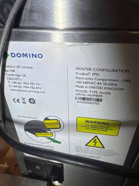 DOMINO INK JET CODER, MODEL AX350I, WITH TOUCH DISPLAY, (1) HEAD, STAND & TABLE, (INV. #35965)(LOCATED @ MDG SHOWROOM PGH, PA), (RIGGING, HANDLING, LOADING & SITE MGMT FEE: $100)